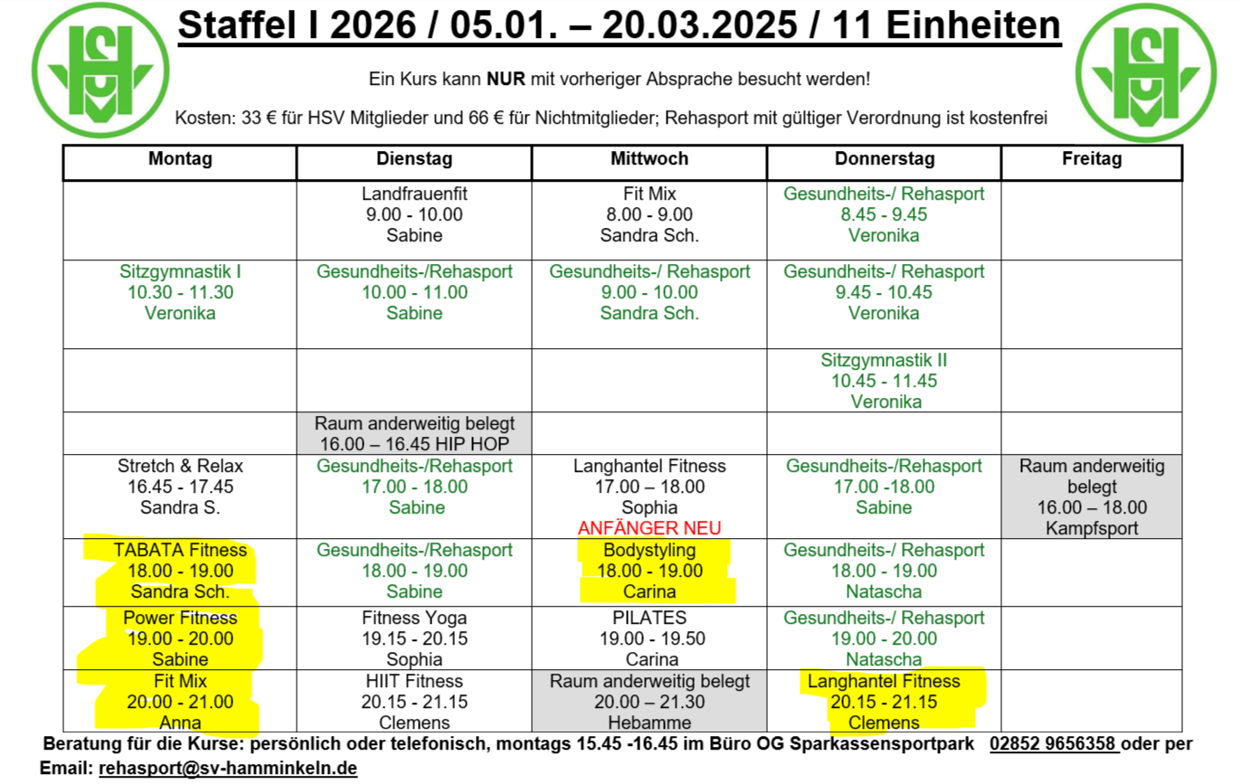 Lassen Sie sich unverbindlich beraten unter 02852 – 9656358 (montags 9:30 bis 12:00 Uhr und 16:00 bis 17:00 Uhr sowie donnerstags 9:30 bis 12:00 Uhr) oder per Email: rehasport@sv-hamminkeln.de